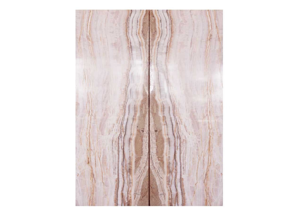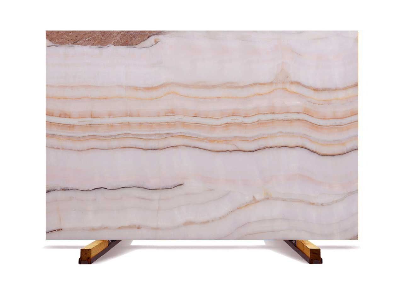 یک سنگ طبیعی لوکس با پایه‌ای از صورتی ملایم تا سفید خامه‌ای است که با رگه‌های افقی ظریف در رنگ‌های هلویی، بژ و صورتی تزئین شده است. سطح صیقلی و شفاف آن کاملا نماینگر بافت سنگ است.